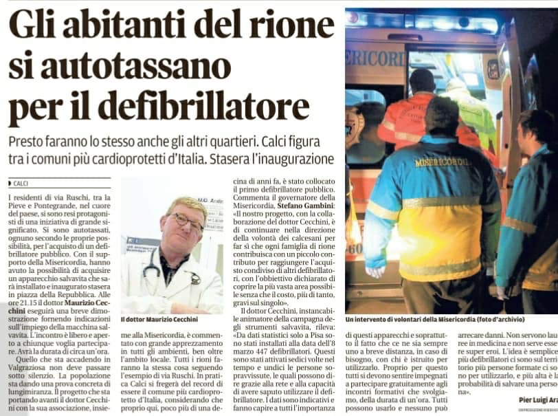 Ieri sera e’ stata inaugurata una nuova postazione, la prima di un progetto ideato dagli amici Andrea LUPETTI e Stefano GAMBINI (della Misericordia di Calci). Il progetto consiste nel coinvolgere gli abitanti dei vari quartieri del paese , i quali autotassandosi di pochi euro, riescono ad acquistare un DAE.