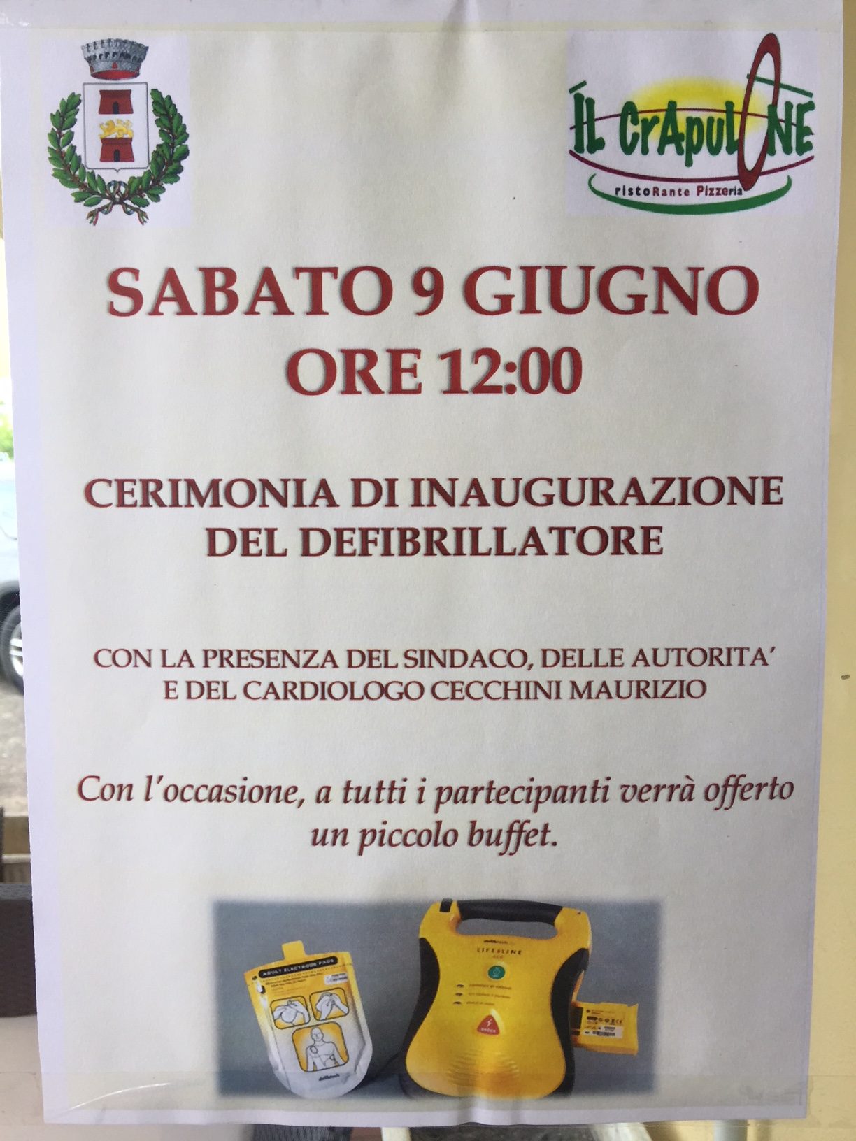Il 9 Giugno, il titolare del ristorante pizzeria “IL CRAPULONE ” in via Vallicella di Fauglia ha inaugurato un DAE, per la sicurerzza dei propri clienti e del personale.