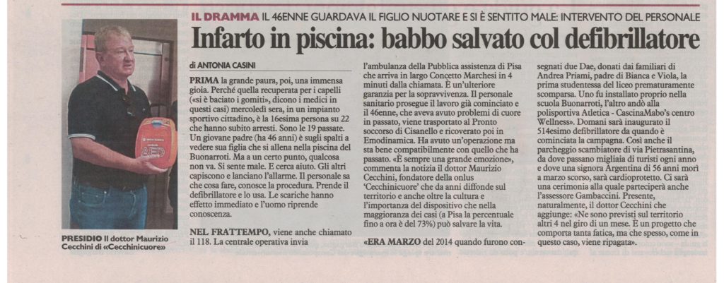 Stava assistendo all’allenamento della figlia nella piscina quando e’ crollato a terra: nell’Istituto era stato installato il 1 Marzo 2014 un DAE ed il personale aveva seguito il nostro corso BLSD.