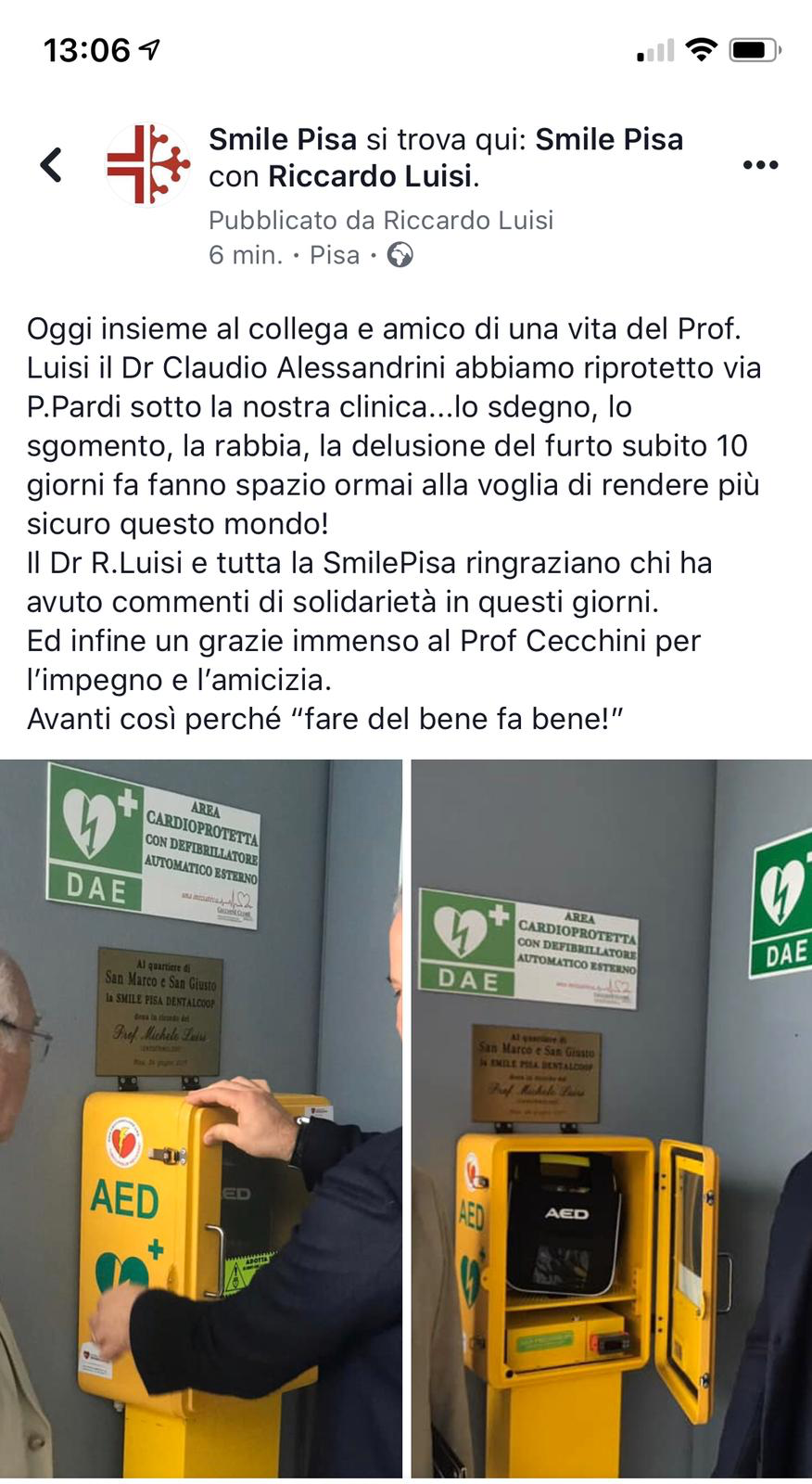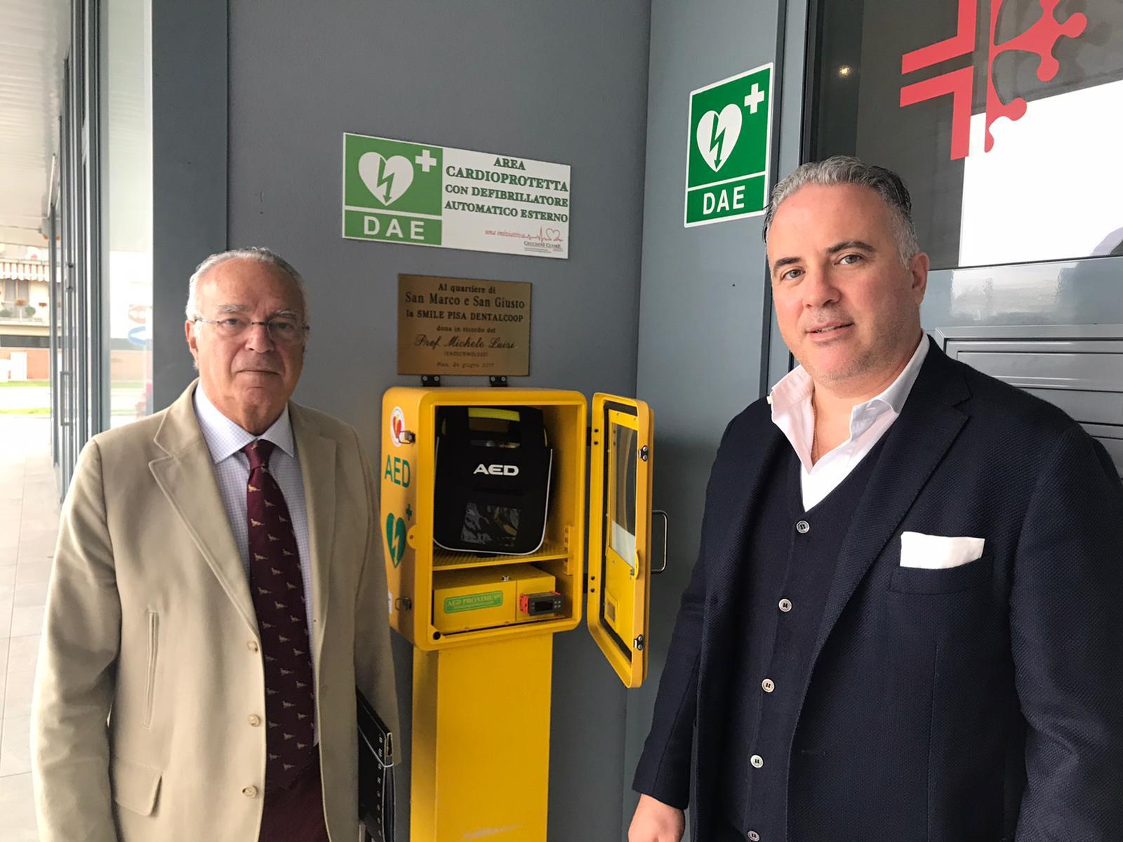 Il Collega Riccardo LUISI, Direttore della “SMILE Pisa” in San Giusto, che aveva donato tempo fa uno dei 4 DAE recentemente rubati ha voluto installarne uno nuovo, nello stesso posto.