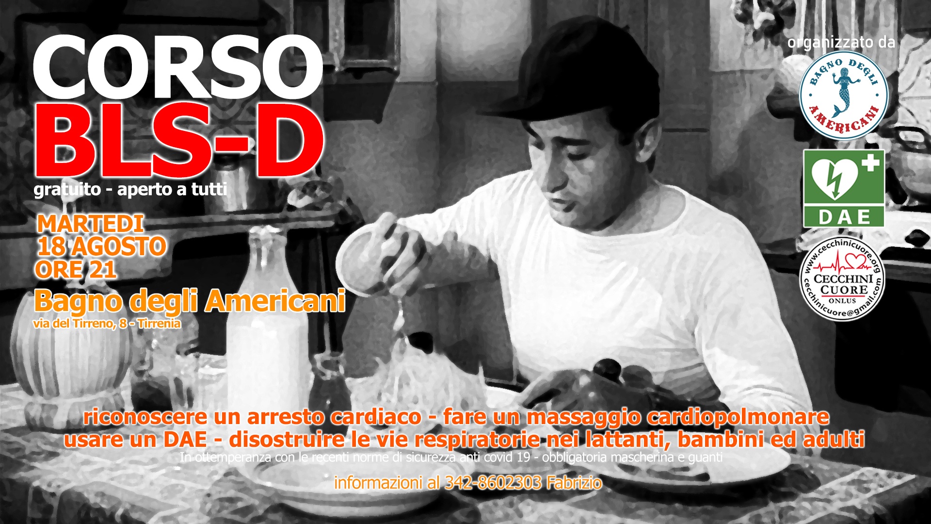Il corso BLS-D si svolgerà il giorno 18 Agosto dalle ore 21 presso il Bagno degli Americani in via del Tirreno, 8 a Tirrenia e sarà tenuto dal Dr. Maurizio CECCHINI, cardiologo dell’Università degli Studi di Pisa, responsabile della cardiologia pediatrica all’ospedale Santa Chiara e dall’istruttore certificato Fabrizio Bonino dell’Associazione Cecchini Cuore ONLUS.