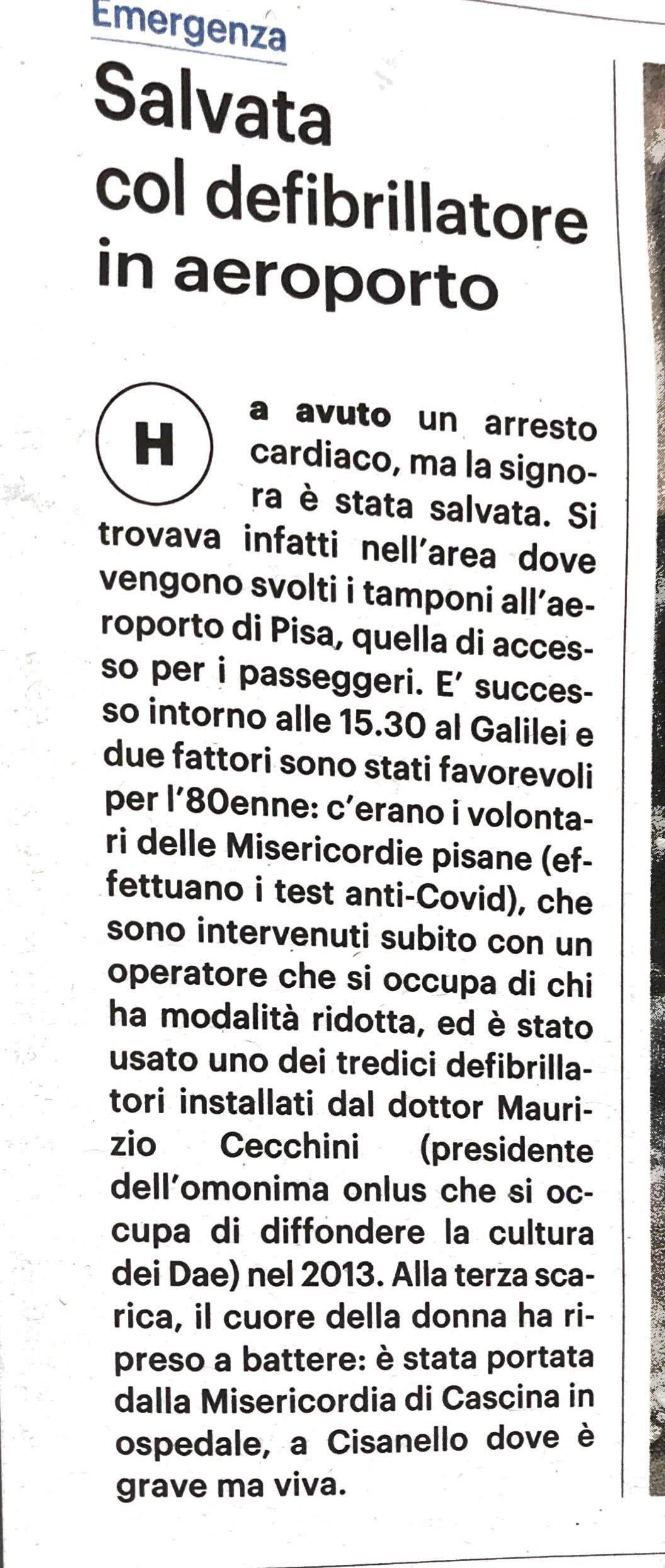 Complimenti agli operatori che hanno impiegato il DAE ed alla intelligenza e lungimiranza della Direzione dell’ Aeroporto di Pisa che condivisero con la CecchiniCuore Onlus questa grande iniziativa.