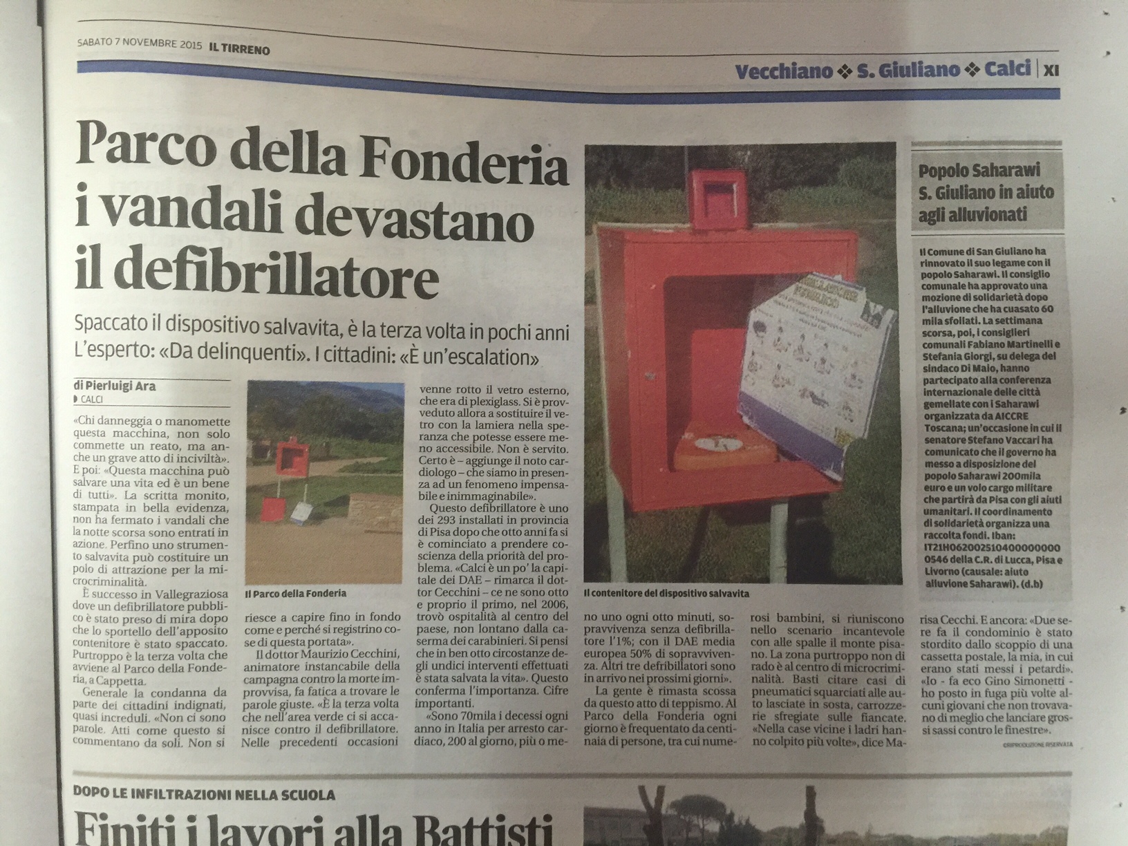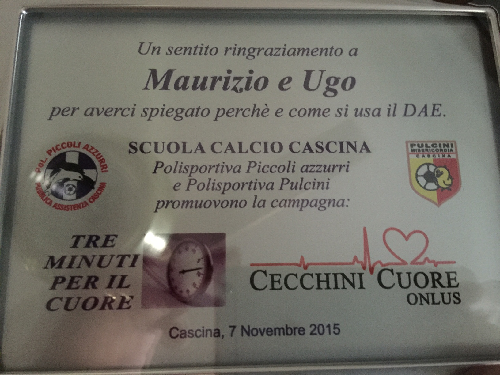 In questa occasione e’ stato donato alla ASD “Piccoli azzurri” un DAE che verra’ posizionato presso il “Campo Nuovo Tettora” di Cascina, in ricordo di Aniello Patrone , Presidente dei “Piccoli azzurri” recentemente scomparso.